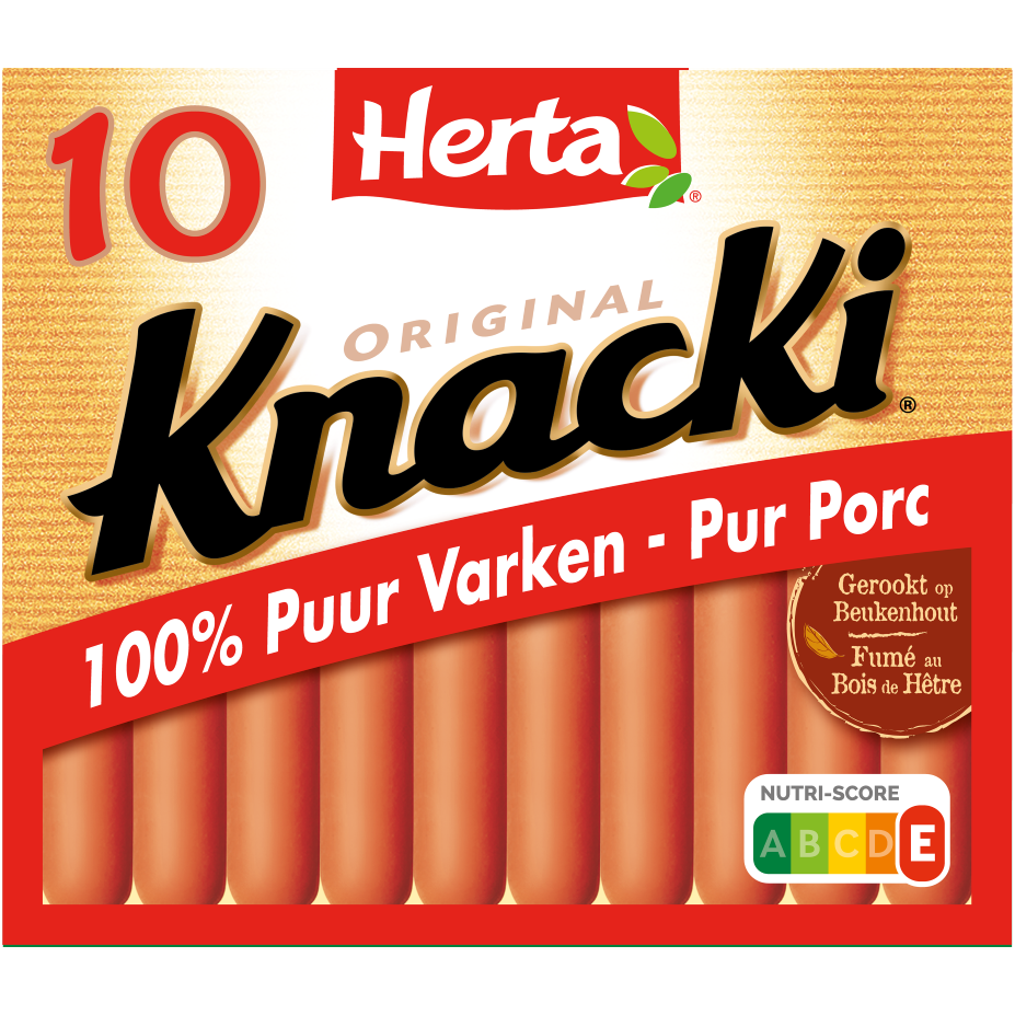 Découvrez Knacki® Original sous un format familial avec 10 saucisses. Des saucisses croquantes à l'extérieur et moelleuses à l'intérieur, qui plaisent à tous les gourmands ! Les saucisses Knacki® sont faits à partir de viande 100% de pur porc et ont un goût fumé unique, obtenu grâce à un fumage traditionnel au bois de hêtre! Vous pouvez les manger froids ou chauds et ils sont prêts rapidement, il suffit de les réchauffer (dans la casserole, au four à micro-ondes ou à la poêle). Délicieux dans un hot-dog !Pour les enfants de moins de 4 ans, coupez la saucisse dans le sens de la longueur puis en tout petits morceaux afin de prévenir les risques d’étouffement.
